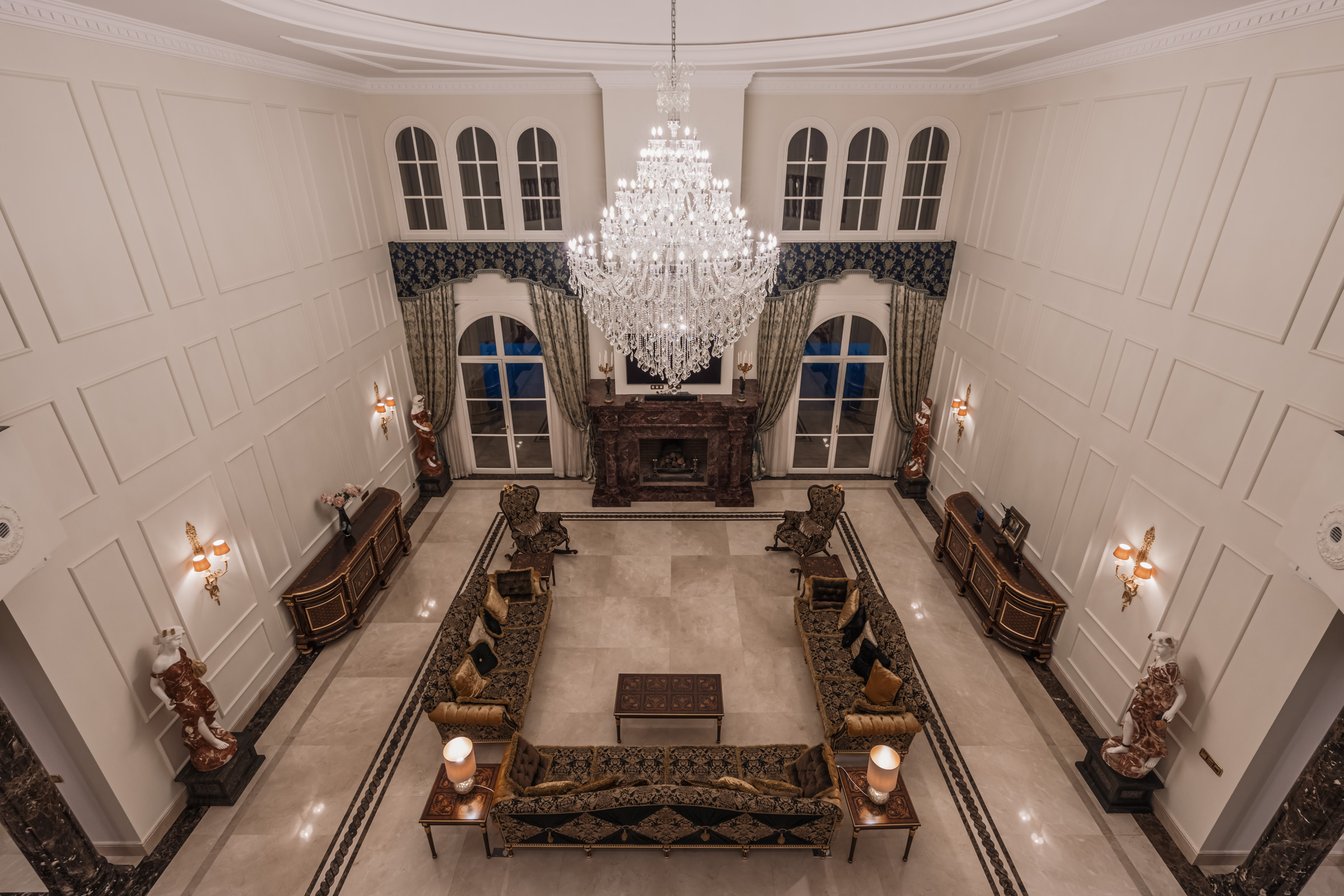 Inside, the home is finished with rich travertine flooring throughout and elevated by unique touches such as fabric-clad walls—eschewing traditional wallpaper for a more refined aesthetic—and gold-plated door handles that subtly announce opulence in every room. The red wood doors are not only visually striking but also serve to complement the estate’s comprehensive soundproofing, which includes soundproofed walls that offer peace and privacy in every corner of the home.