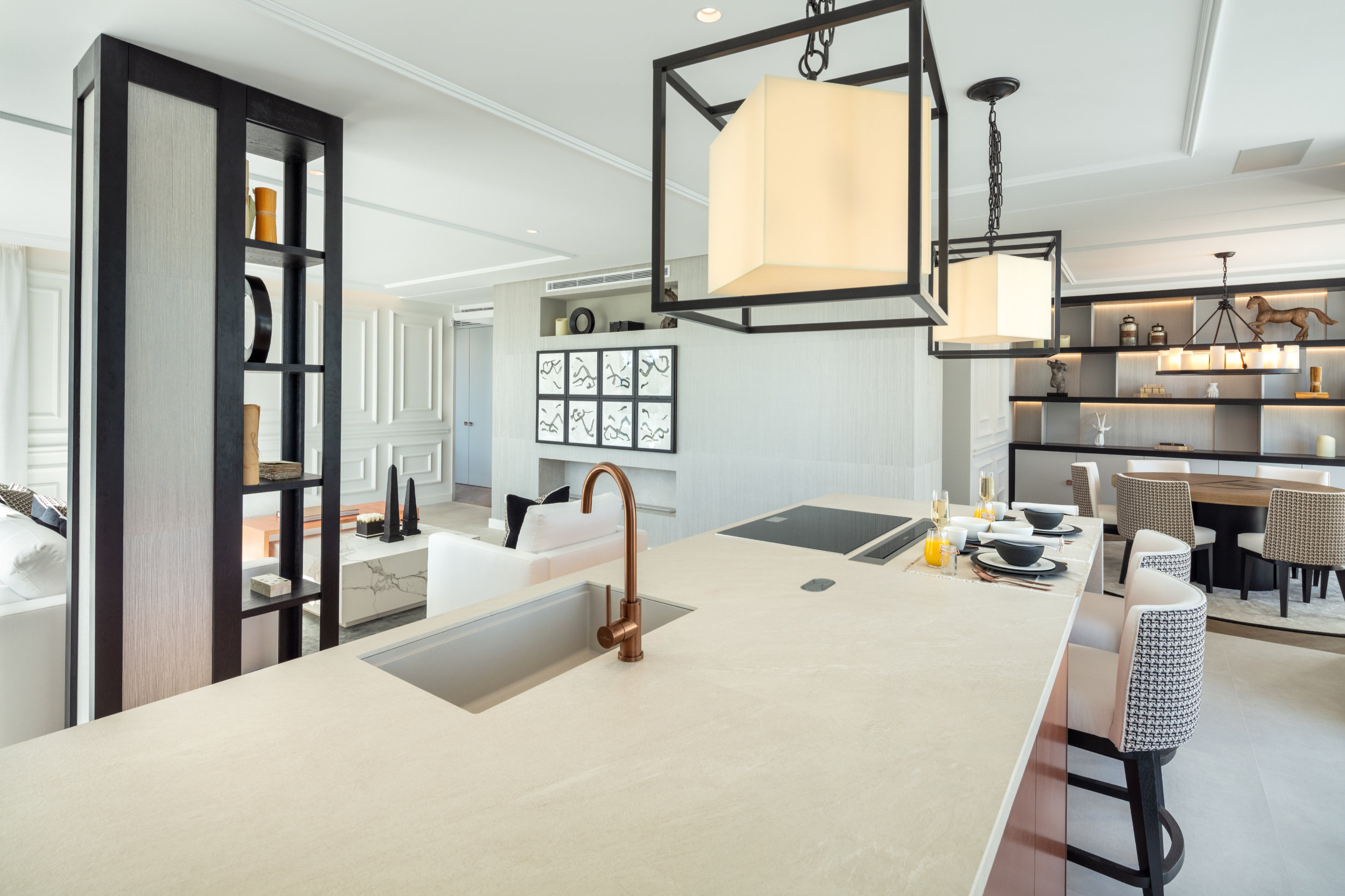 Custom finish cabinets made with Formica sheets in a Copper finish and Veravent CANO Copper taps INALCO worktop in white with Plus Bush-hammered finish from the Pacific series
