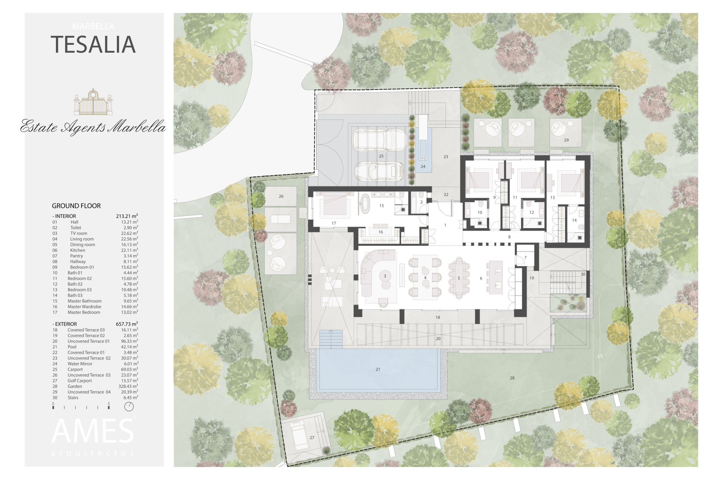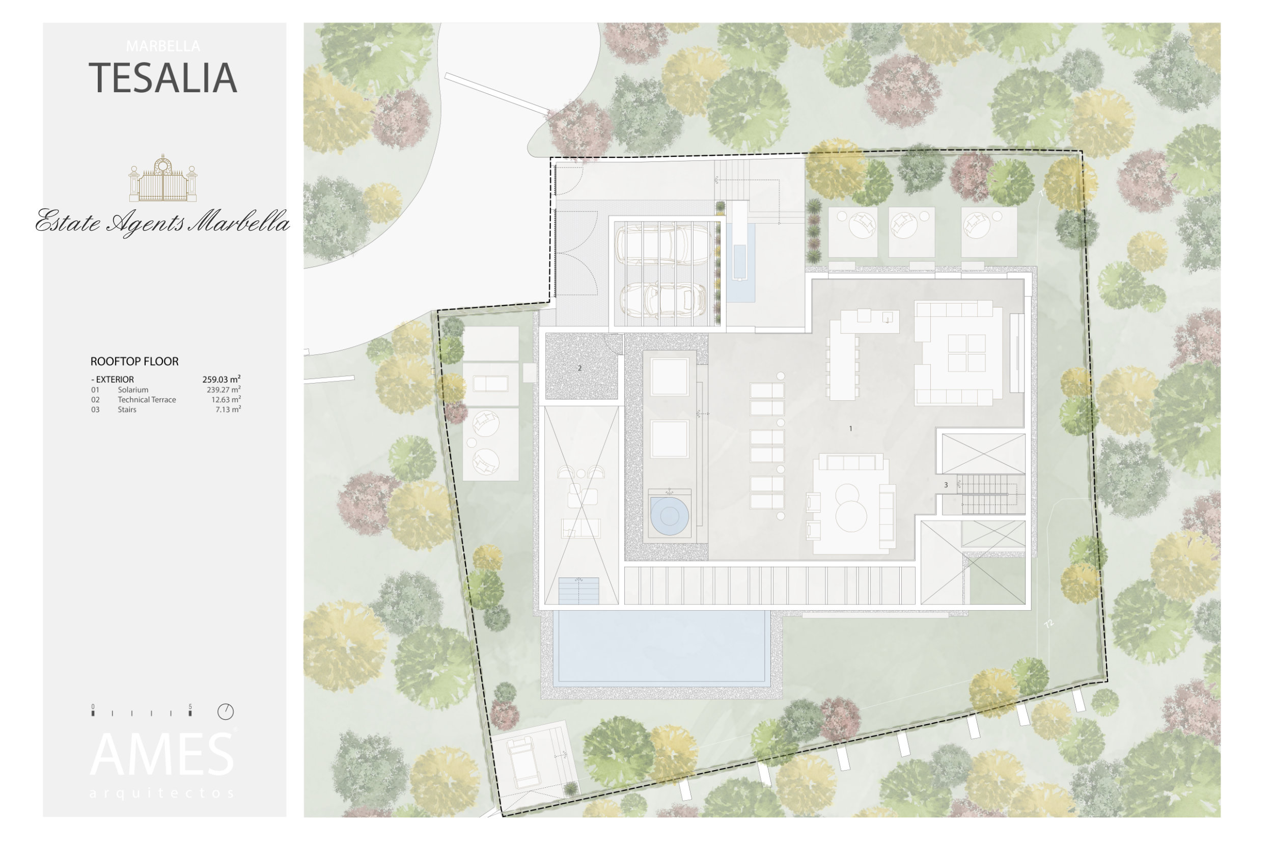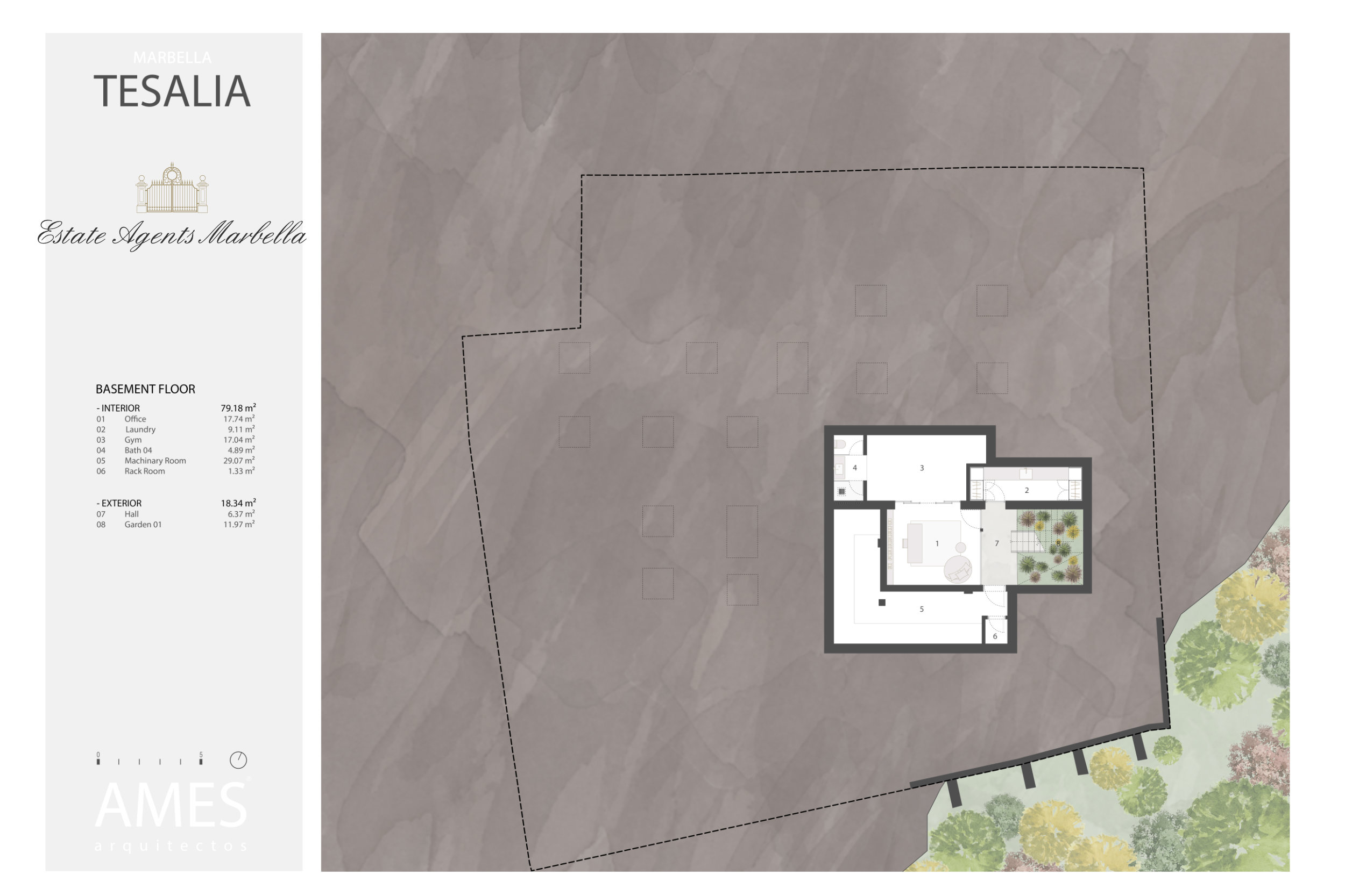 Stepping into Casa Tesalia you are welcomed by a modern and sleek living space with a nice design kitchen in an open plan to the dining and living room. Through the large floor to ceiling glass doors, you´ll get an amazing view over the golf course of Los Naranjos. Furthermore, on this level there´s 4 bedrooms, all en-suite and with its own terrace. The master bedroom with it´s almost 40 m2 includes a walk-in closet and designer bathroom in an open plan to create that luxurious suite feeling.