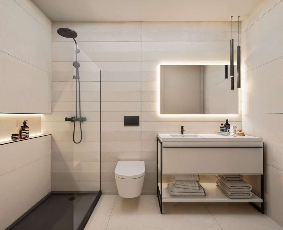 The en-suite bathroom in the secondary bedroom features state-of-the-art equipment and contemporary design. Porcelain tile floors and walls, a minimalist shower with floor-to-ceiling glass, integrated sink countertops, high-quality base cabinet with two drawers (choice of color or wood-effect finish), and a backlit mirror combine functionality and elegance.