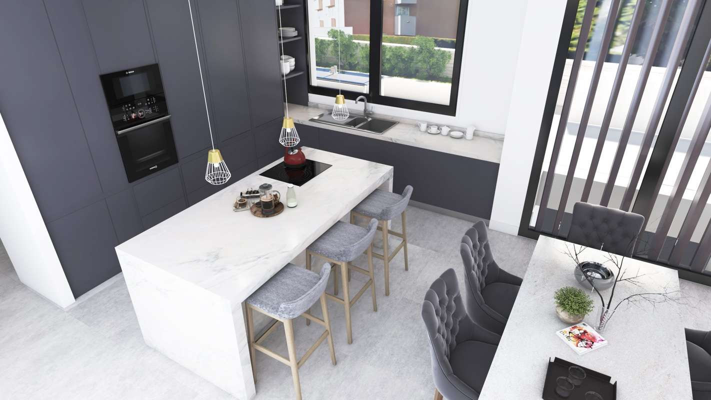 The contemporary layout flows effortlessly throughout the home, creating an environment that perfectly balances style and practicality. Designed for both everyday comfort and sophisticated entertaining, the kitchen offers a selection of premium-quality countertops in resin, porcelain, or natural stone—each combining timeless elegance with exceptional durability.