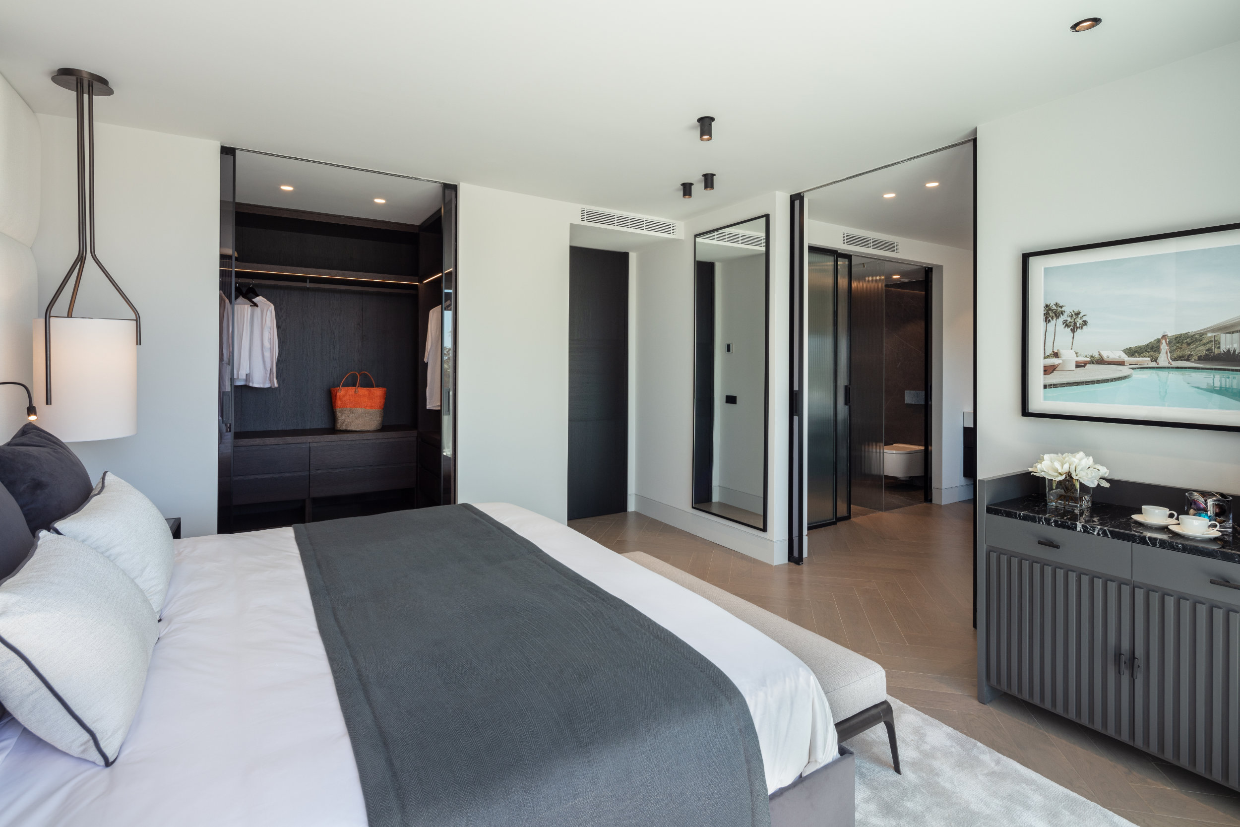 An additional well-appointed bedroom on this first floor also has an en suite bathroom and views out to the gardens of the Puente Romano. You can find the third double bedroom on the ground floor, positioned to have privacy from the main living area, enjoying views of the retreat style gardens. Decorated with a neutral palette and luxurious fabrics to create a cosy and calm haven, this bedroom has their own en suite bathroom with walk- in shower and top-of-the-range fixtures and fittings to create a practical and functional space.