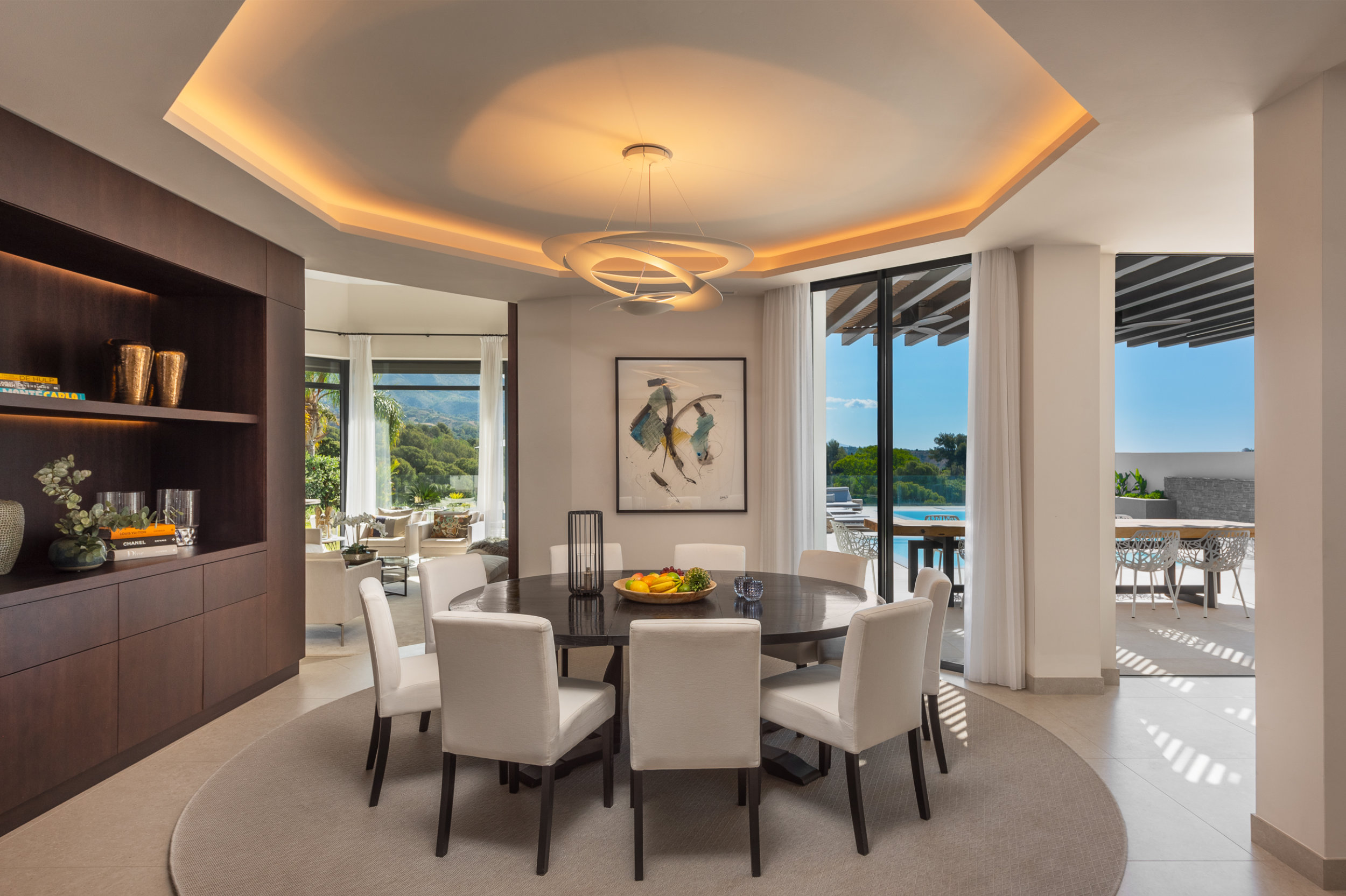 Villa La Vista features a contemporary design with an Andalusian touch. It sits on an 1158 m² plot and offers 351 m² of living space and 135 m² of terraces and porches, all on one floor. The open-plan living room, equipped with a 65” Samsung Smart TV and an ethanol fireplace, overlooks the garden and La Concha Mountain through floor-to-ceiling windows, flooding the space with natural light. The modern kitchen is equipped with Gaggenau appliances, a breakfast bar, and a full-height integrated Gaggenau wine cooler.
